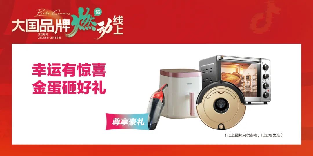 活動期間,上抖音觀看百特陶瓷門店直播,預約小風車并預留新房裝修信息;或點擊門店賬號商城了解活動產品,即可享受百特陶瓷3重大禮。