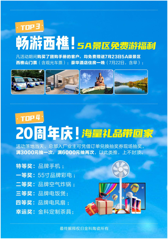 本次活動不僅有總部推出的巔峰讓利,豪禮抽獎之外,更是創新地將活動落地形式從原來的單日返往純購物式落地更改為兩天一夜購物+旅游式落地。讓廣大業主朋友來佛山不僅能夠廠價購金科品質好磚,更能夠借此領略國家5A級景區佛山西樵山的風采。