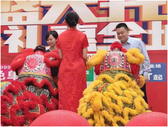 ▲廣西百色市工商聯(lián)副主席陳瑩、能強(qiáng)瓷磚百色優(yōu)秀服務(wù)商黃紹林共同為醒獅點(diǎn)睛