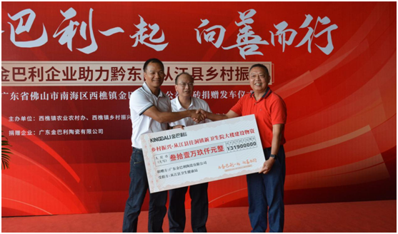 為貫徹落實鄉村振興發展戰略,金巴利企業以高度的社會責任感,積極響應鄉村振興號召 ,捐贈貨值31.9萬愛心瓷磚助力貴州市從江縣往洞鎮新衛生院大樓配套設施建設項目,為國家脫貧攻堅工作添磚加瓦。