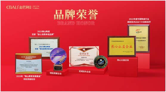 2023年金巴利瓷磚所獲榮譽,連續2屆榮獲新銳榜【區域龍頭企業】稱號、2022年度中國陶瓷行業高新技術企業十大創新標桿、2023佛山陶瓷百家“放心消費承諾品牌”、2023年“樵山教育發展基金”特別貢獻紀念、熱心公益企業、特別貢獻企業。