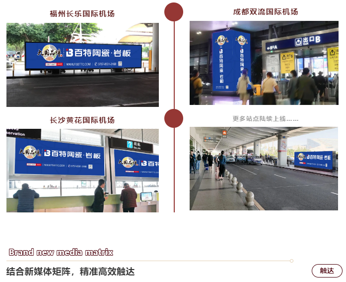 機場作為現代交通的重要樞紐,其龐大的客流量意味著廣告的觸達率極高。選擇投放機場廣告,是百特陶瓷對品牌宣傳的一次戰略性投資,旨在進一步提升品牌知名度與影響力,實現品牌全方位、多維度的戰略性宣傳。