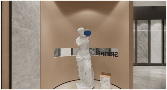 入口處利用半墻的方式打破了常規(guī)形象墻布局,增加空間層次感,擺放的雕塑在與背景色彩、線條碰撞中予以優(yōu)雅有趣的感官體驗。