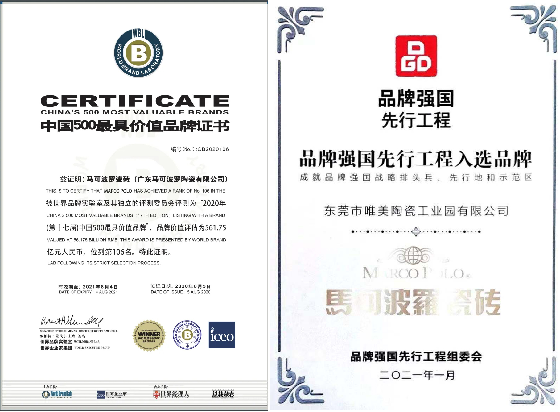 2021年,馬可波羅瓷磚入選“品牌強(qiáng)國(guó)先行工程”,并被廣東卓越質(zhì)量品牌研究院授予“卓越質(zhì)量品牌”。