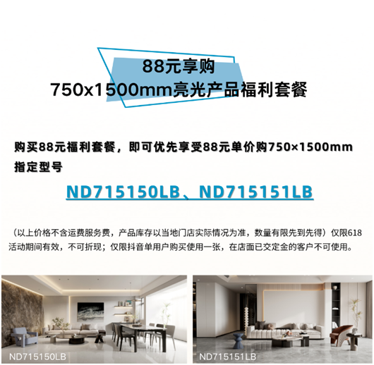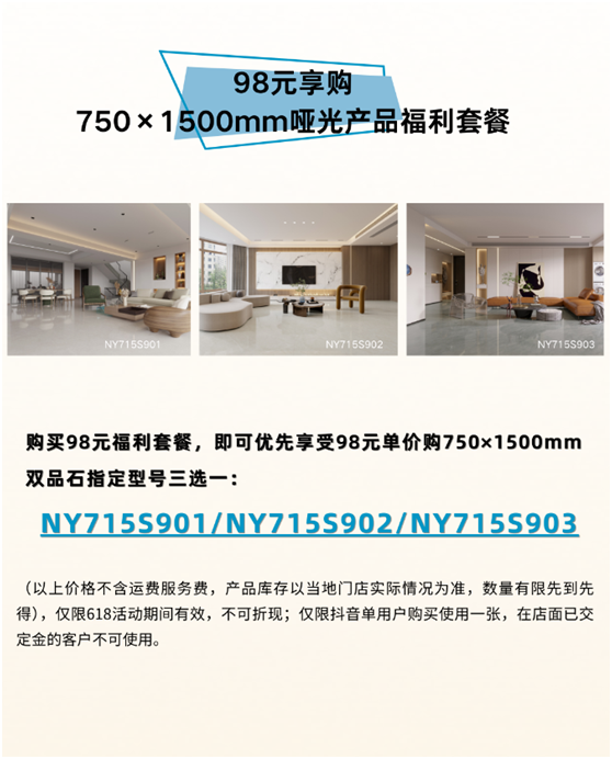 政策說明:拍下此券即可鎖定權(quán)益:用戶到店購(gòu)買能強(qiáng)極致理石、拾光輕理石、星辰大海、素色磚、天鵝絨、法蘭絨等系列600×1200mm或750×1500mm規(guī)格產(chǎn)品滿80㎡,即可立減800元,此優(yōu)惠券與其他活動(dòng)產(chǎn)品不可疊加使用,不可折現(xiàn);僅限抖音單用戶購(gòu)買使用一張,在店面已交定金的客戶不可使用。