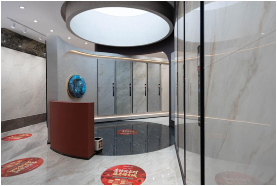 極致理石系列新品53°珠光云朧素月展示用流線型墻面形成強烈視覺核心。圓形天窗在地面上投射出迷人倒影。墻面搭配線性燈帶,打造出充滿張力與格調的8135黃金規格區域。