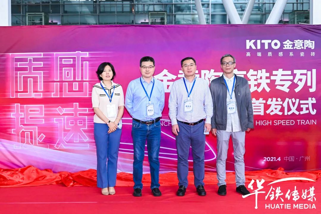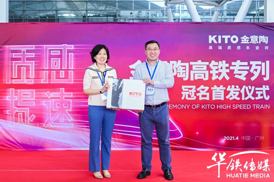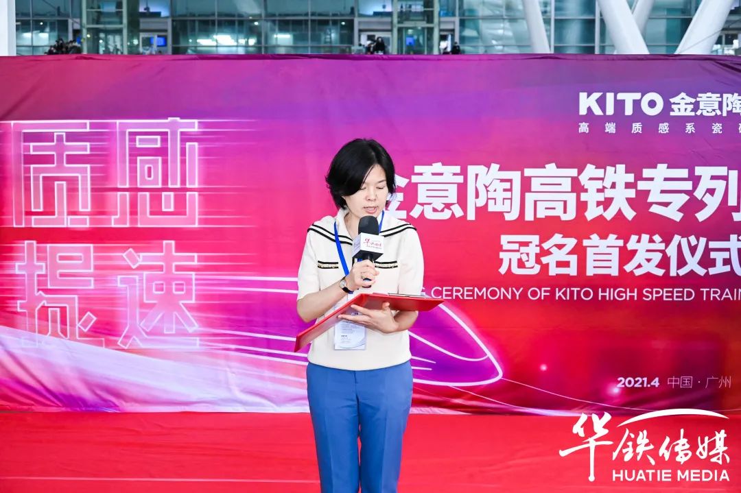 現場,華鐵傳媒集團有限公司廣州中心第五事業部銷售副總經理于平女士、金意陶集團副總經理兼瓷磚事業部總經理侯波先生等領導一起為金意陶冠名高鐵專列剪彩。