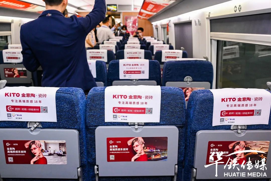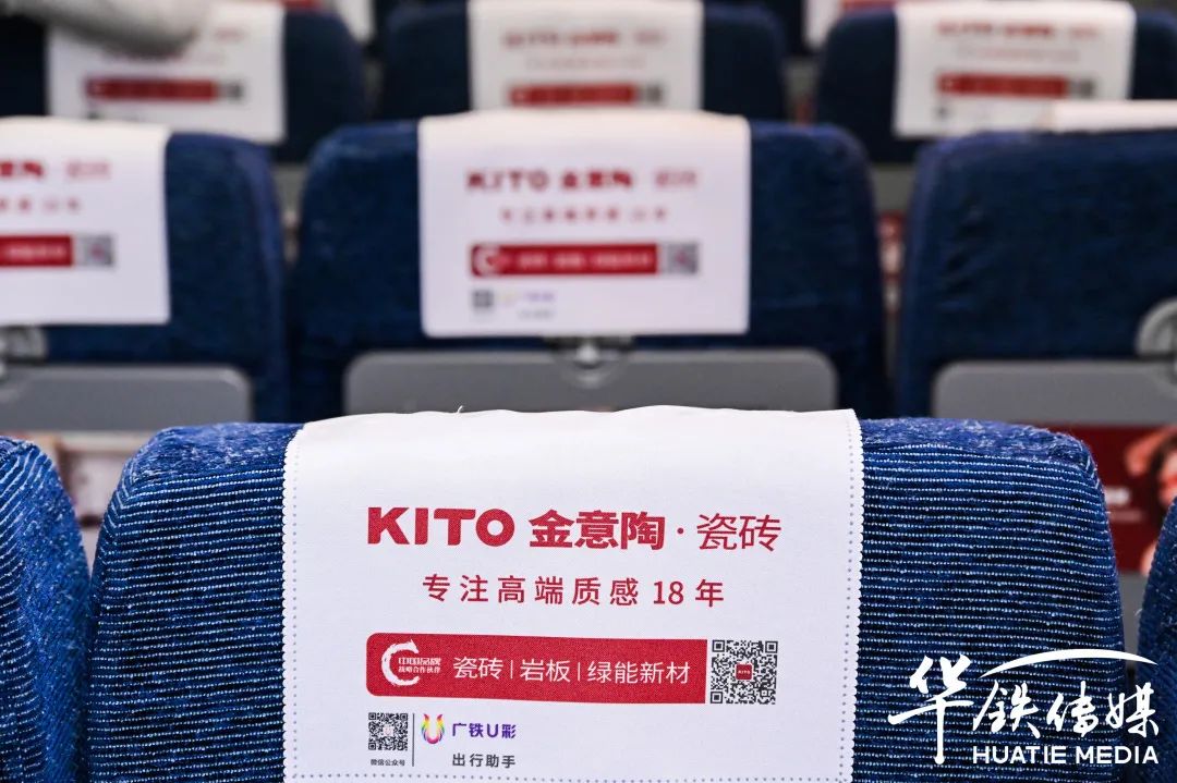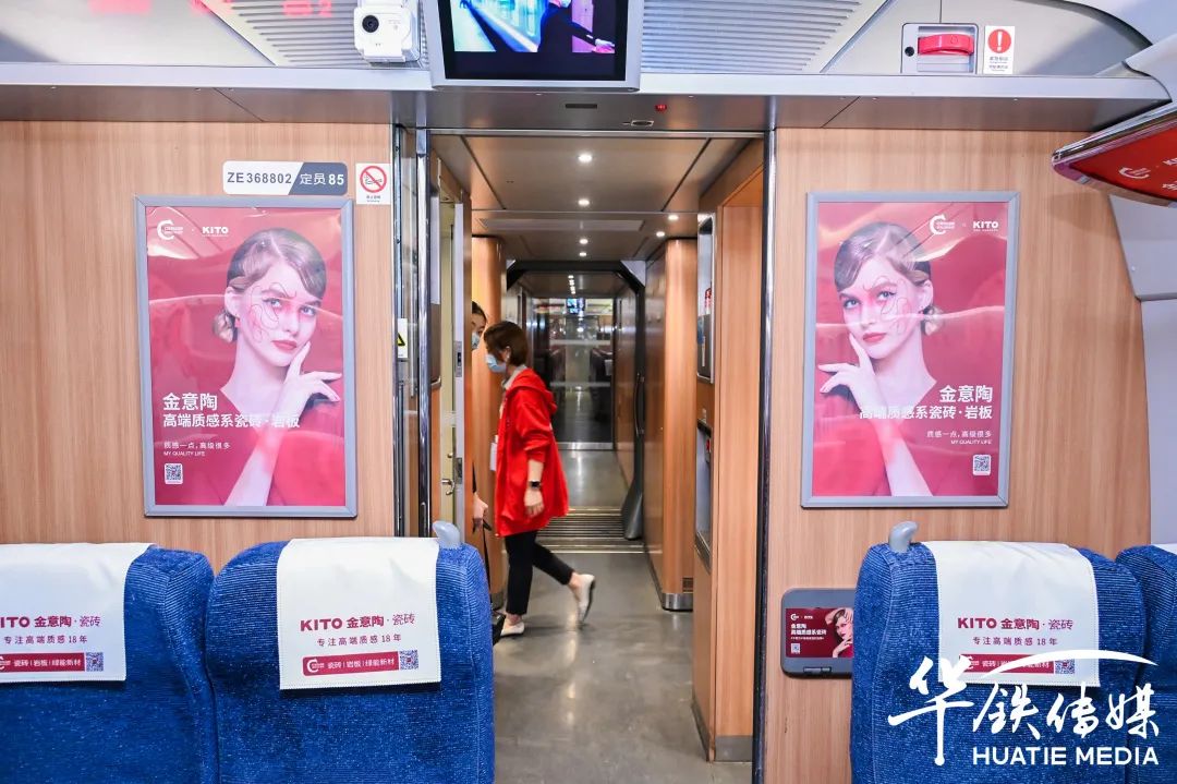 金意陶此次投放的列車全媒體將穿梭在全國各地高鐵站中成為最靚麗的品牌風景線,從進入車門到落座,全方位多視覺的布局,重復性實現吸引,不斷深化品牌形象。通過頭枕巾、小桌板、車身貼、品牌天幕、LED顯示屏、車門貼、海報等,乘客們仿佛置身于金意陶品牌專屬傳播空間。高鐵乘客巨大的流動性,勢必會為高鐵車廂內的金意陶品牌宣傳帶來更廣闊的影響力。