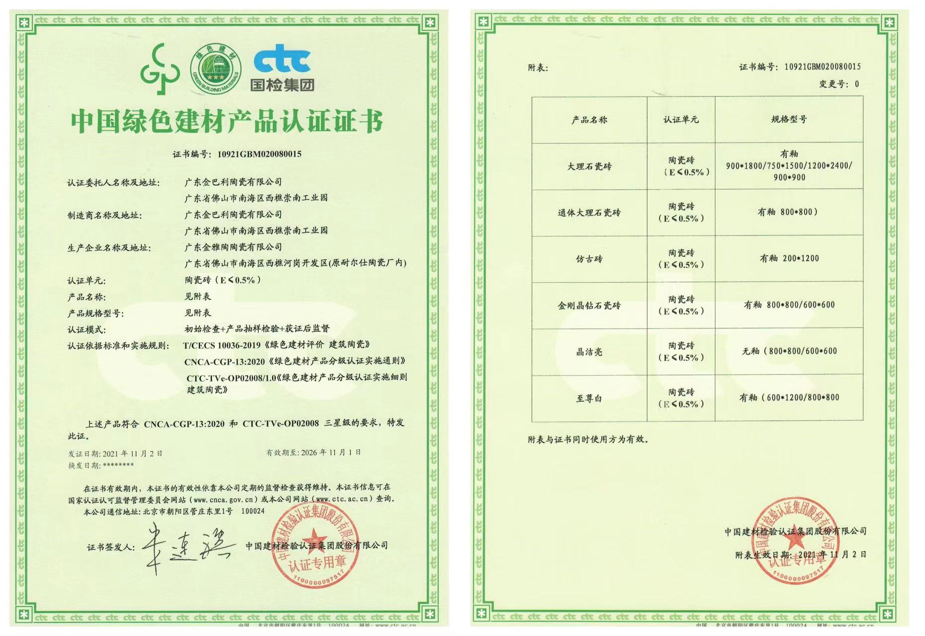 金巴利瓷磚獲得“中國綠色建材產品認證證書”,是對金巴利產品高功率、低能耗、綠色環保的肯定與認可。