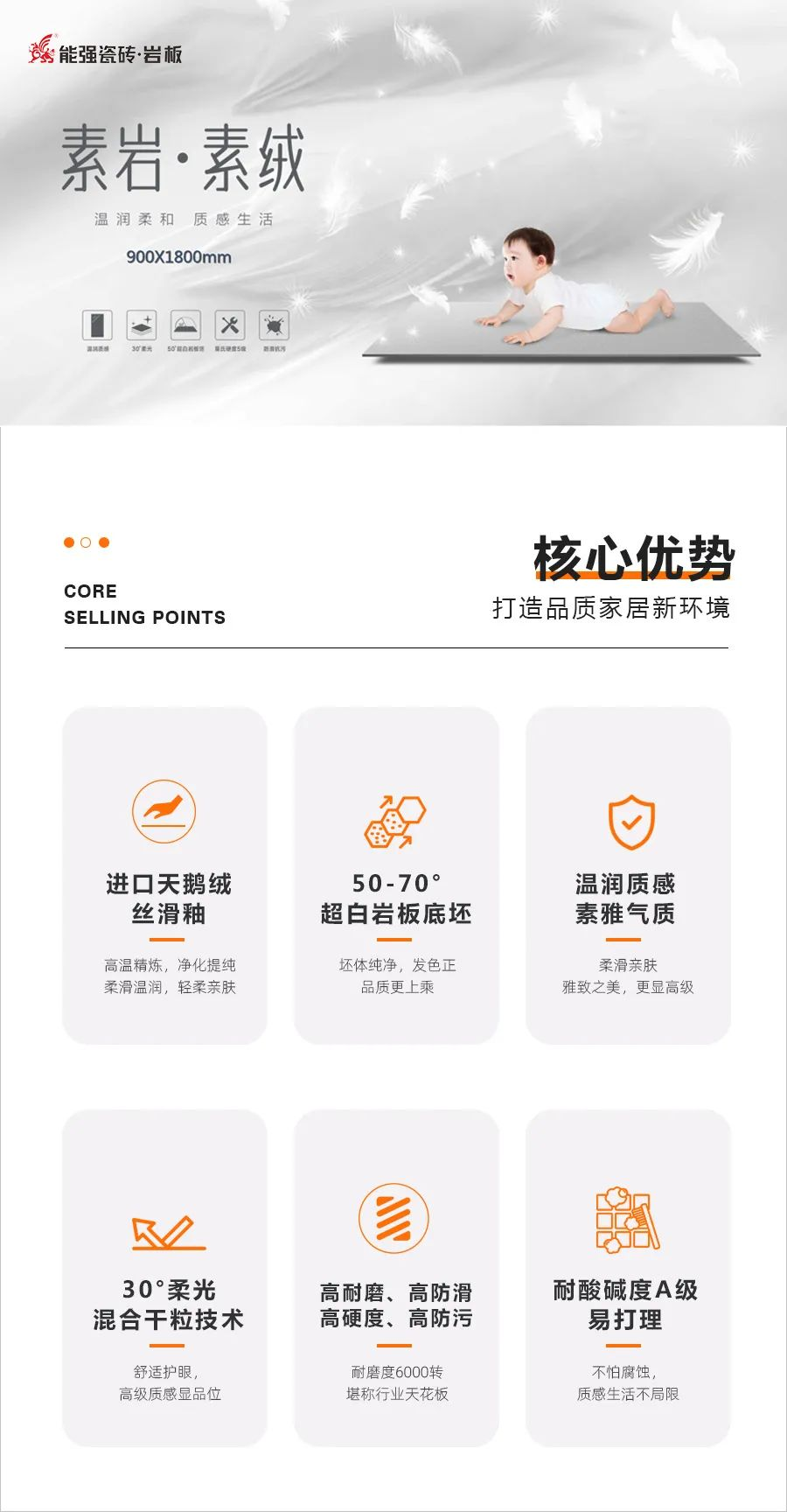 在產品研發中融入石材“硬”與質感“柔”的設計靈感,透過進口天鵝絨絲滑釉高溫煅燒,塑造如綢緞般細膩磚面,讓瓷磚擁有極致觸感,給使用者帶來不一樣的家居體驗。