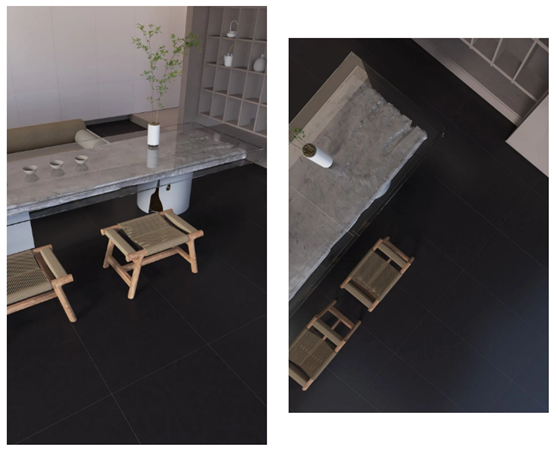 GYT750512濃郁深黑,采用國際色彩中最純凈的黑色,色彩深邃而神秘,整體鋪貼使空間表現出莊重而又高雅的特征,可以讓人有與生俱來的高級感的體驗。采用數碼釉技術,產品光感控制7-10度微光質感則弱化了黑色的冰冷氣息,如磨砂般的質感,雕琢出空間的別具特色。