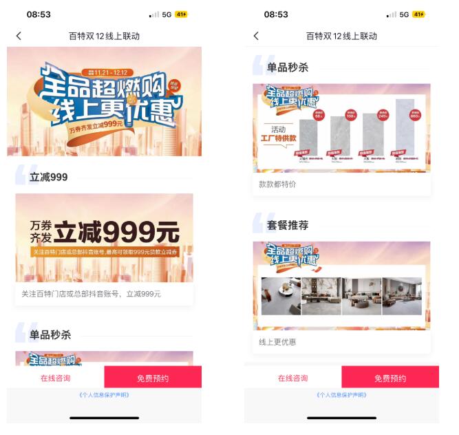 本次雙12線上活動,門店通過抖音、視頻號、社群、直播海報、總部宣傳等方式,進(jìn)行多渠道預(yù)熱,流量蓄水前置,為直播帶來更多的人氣。通過999優(yōu)惠券,借助營銷工具完成對用戶的轉(zhuǎn)化,輕松獲得意向客戶留資
