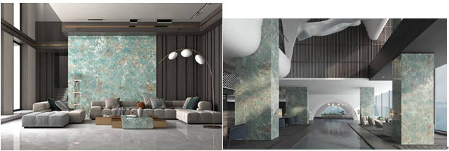 亞馬遜綠是來自巴西熱帶雨林的寶石級珍貴石材,以稀有的藍綠色寶石,與深淺顏色不一的石英石和黑色云母,搭配出一種如孔雀般高貴典雅的畫面。