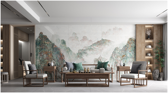 山水畫系列的巖板背景墻,是家居茶室空間的顏值擔當,以大自然為靈感,復刻自然萬物獨特紋理,將無限延伸的視覺藝術注入家居生活空間中。