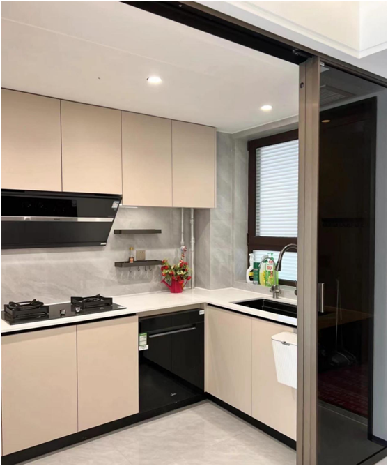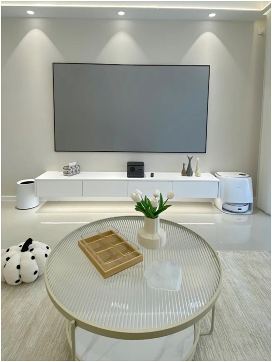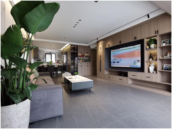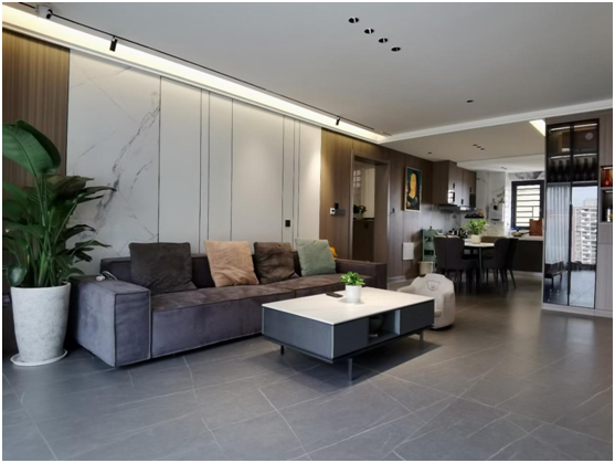 本案業主選用金科巖板?阿瑪尼灰通鋪地面,以灰色調滿足侘寂風的風格需求之余,利用巖板強防污、超耐磨等特性,節省打掃衛生的時間,且高級灰的配色呈現出滿滿的工業氣質,卻在細節之中融入溫情的生活氛圍,以極簡的設計手法還原生活的本真狀態。