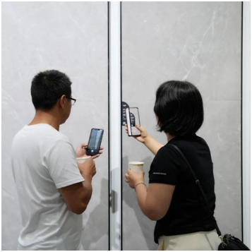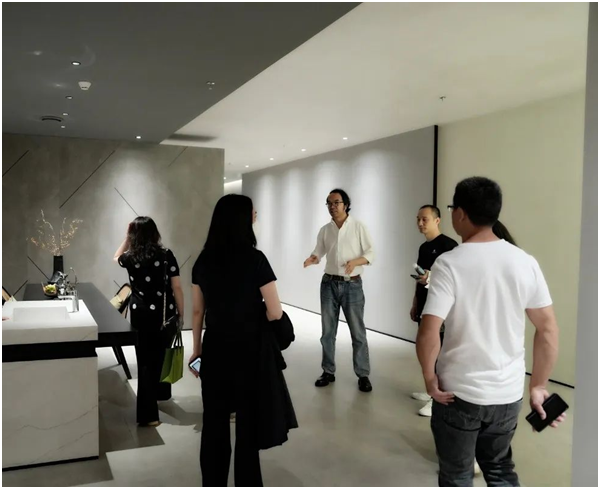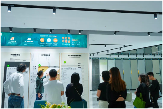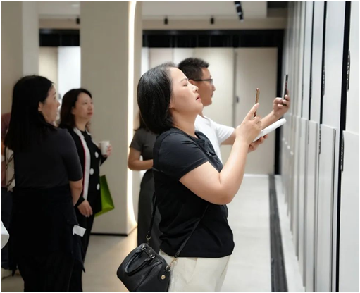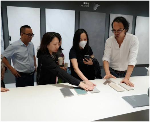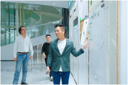 薄板是當下有效減輕建筑自重,節(jié)能環(huán)保,生態(tài)友好型建陶新型材料,贏得了嘉賓們的高度關(guān)注。在惠達LA’BOBO唐碩度帶領(lǐng)下,一眾領(lǐng)導(dǎo)嘉賓參觀了惠達LA’BOBO總部展廳,就惠達薄板、巖板產(chǎn)品及免打拆二次翻新解決方案等在不同空間的應(yīng)用以及施工工藝展開了探討和交流,其中包括薄法濕貼工藝、保溫一體外墻應(yīng)用、內(nèi)裝應(yīng)用、家居產(chǎn)品應(yīng)用與二次翻新等工藝技術(shù),近距離感受惠達對薄板、巖板在技術(shù)應(yīng)用研發(fā)和創(chuàng)新上的匠心魅力。