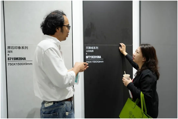 惠達瓷磚作為行業(yè)全品類、全規(guī)格的瓷磚品牌,全新推出的900X1800雅致大理石成為嘉賓們的重點關(guān)注。在惠達瓷磚事業(yè)部總經(jīng)理嚴仕杰、惠達營銷中心總經(jīng)理曹普根、產(chǎn)品研究院院長趙雪松等一眾領(lǐng)導(dǎo)陪同下,考察團參觀了惠達瓷磚超防滑美學(xué)館。在參觀惠達瓷磚展廳期間,惠達瓷磚防滑質(zhì)感美學(xué)的空間展示,品類豐富的產(chǎn)品以及強大的企業(yè)實力贏得了各位嘉賓的高度贊許!嘉賓們不時駐足觀看惠達瓷磚的產(chǎn)品細節(jié),了解產(chǎn)品工藝、產(chǎn)品賣點、推廣效果等各方面的情況。嘉賓們對惠達的超防滑大理石、萊姆石、西沙、加勒比砂巖等質(zhì)感系產(chǎn)品表示肯定和給予贊譽。尤其對惠達瓷磚本屆陶博會推出的900X1800雅致大理石表示濃厚的興趣并給予了設(shè)計搭配上的專業(yè)評價與建議。