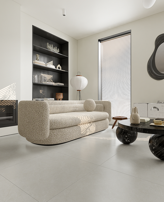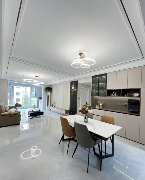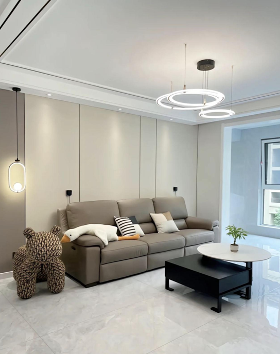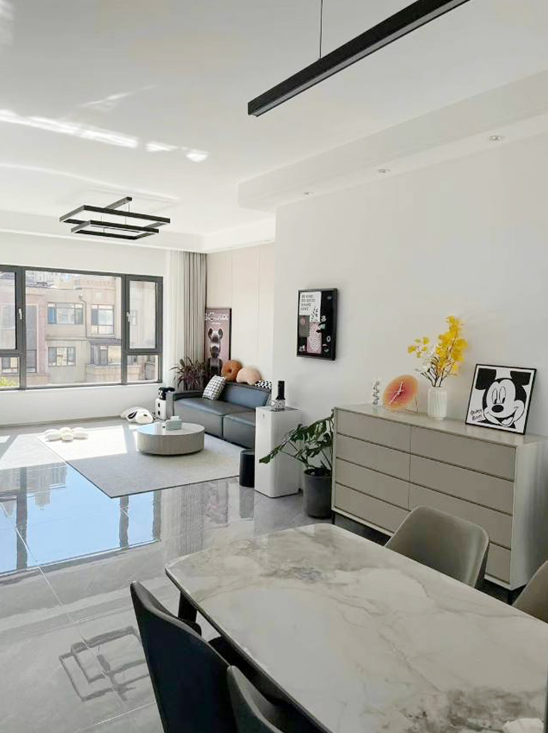 750x1500mm的金科大板·云多拉淺灰作為地磚全客廳通鋪,搭配頂面簡約線條造型的主燈,視覺上盡顯通透。在家具軟裝上,本案業主也遵循刪繁就簡的理念,選用簡單的圓幾穩居中央,搭配黑色皮質沙發,低飽和的配色,不奪人眼球,bearbrick的潮流掛畫的介入,彰顯屋主高級而個性的審美。