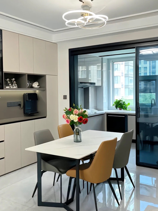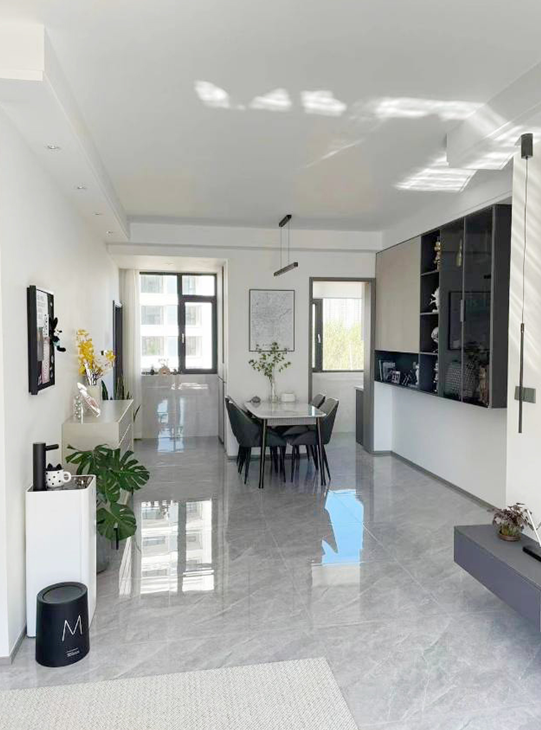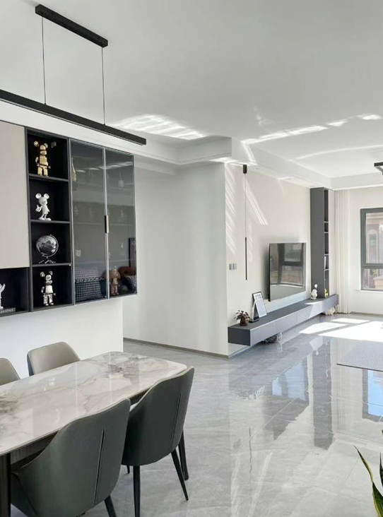 本案例選用了星耀巖板·世紀冰河通鋪,紋理清晰自然,讓整個家居空間靈動不沉悶。黑白灰的色調簡約清爽,業主不僅通過造型可愛的坐凳和毛絨抱枕調和,讓空間充滿了趣味性,而且通過暖咖色桌椅的搭配,中和了空間的冰冷感,讓時尚大氣和溫馨個性自然流露。