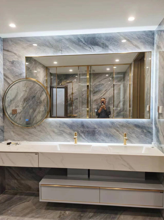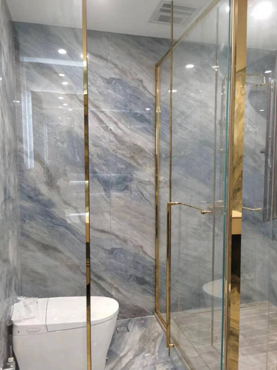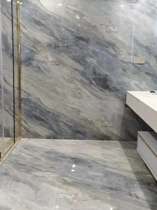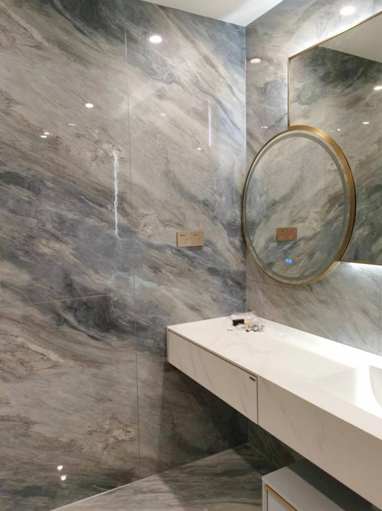 金科星耀巖板系列具有核心專利工藝,最表層釉面之下含有閃光晶粒,光照之下呈現閃閃發光的效果,使產品立體感更強烈。而星白玉藍這款產品,紋理設計上添加了藍色元素,與星空呼應,墻地一體讓整個衛浴空間猶如星空,燈光加持之下的閃光晶粒猶如繁星,散發著浪漫的奢華感。