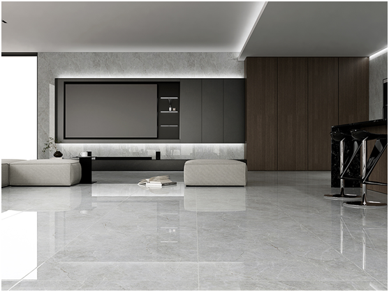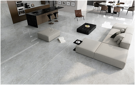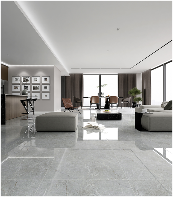 陽光透過窗戶溫柔灑落,與尼諾灰通鋪的地面共融,營造出寧靜而深邃的氛圍。家具簡約,色彩和諧,仿佛在低語著現代生活的優雅與從容。