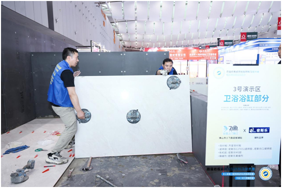 2025年4月18日,鋪貼行業權威機構《中國陶瓷工業協會》旗下的中裝工匠俱樂部(CDCC) 精彩亮相佛山潭洲陶瓷展3號館,舉辦了首屆巖板瓷磚粘貼材料及技術展。金科瓷磚作為合作伙伴全程獨家提供賽事用磚,以卓越品質為工匠們搭建展示技藝的舞臺。經過三天的現場施工演示,不僅展示出了來自全國各地六個杰出施工團隊的風采,更展現了金科瓷磚的狀元品質。
