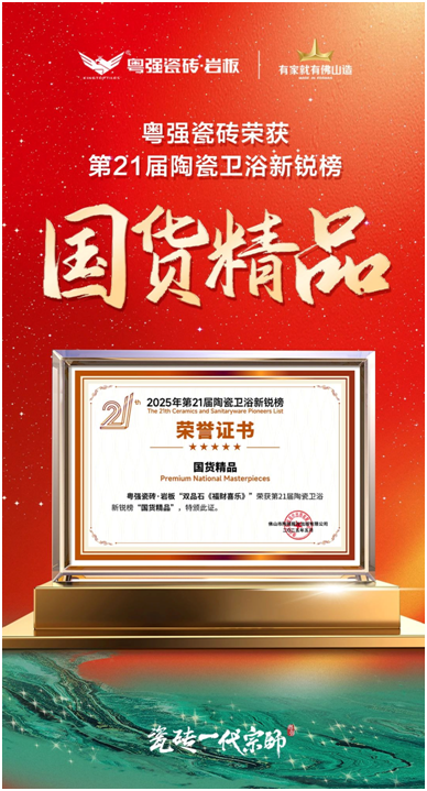 作為陶瓷衛浴領域歷史最悠久、產業鏈覆蓋最廣的評選標桿,新銳榜素有"行業奧斯卡"之稱。本屆評審從“創新性、技術突破、市場價值、文化傳承”四大維度全面考量。粵強瓷磚榮獲“國貨精品”大獎,不僅是對其品牌實力的權威認證,更是對其在國潮文化創新領域深耕成果的至高褒獎。