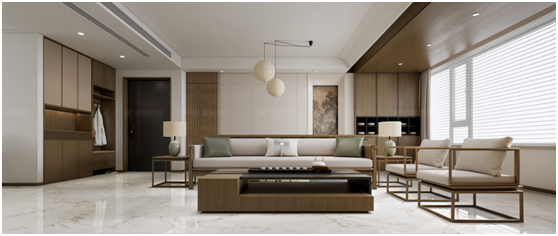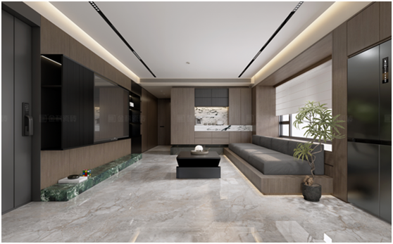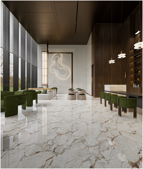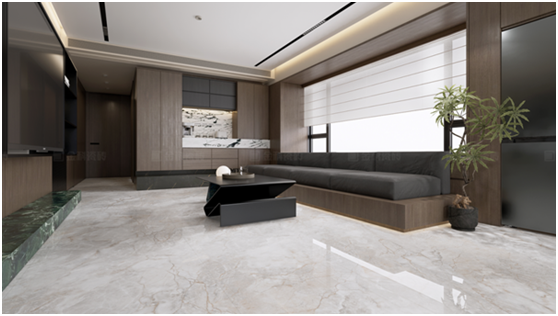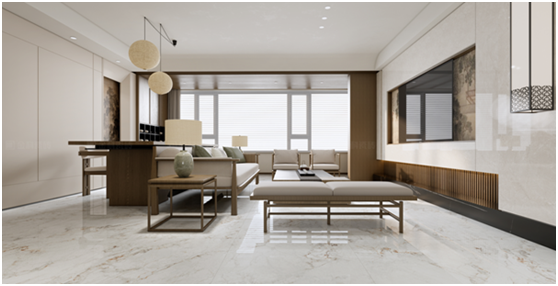 云絮般的天然石紋在地面舒卷蔓延,霜白為底,淺棕暈染,靜臥成空間的詩(shī)意基石。當(dāng)暖光傾落,磚面浮起的粼光漾出柔潤(rùn),以大地般的包容將現(xiàn)代侘寂之美凝于方寸。