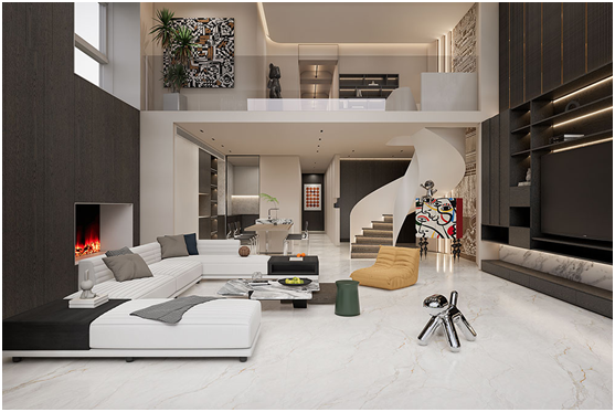 如靜淌的月光鋪滿空間。「卡絲黛爾」潔白之上,絲絲縷縷的金色細紋,恰似隱秘流淌的光河,溫柔托起整個客廳的基調。無需喧嘩,它以柔潤的光澤與雅致的紋路,靜靜沉淀出一室的寧靜與高級質感。