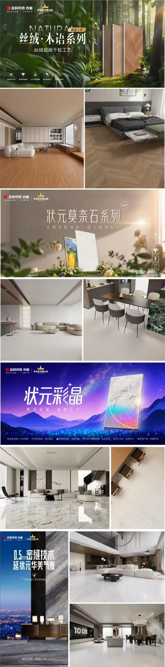 近年來,金科相繼推出絲絨木紋磚、莫奈石、彩晶、珠柔拋、天鵝絨、復刻釉等多類功能型、環保型產品,以技術實力推動產品向高端化、國際化邁進,持續引領行業高質量發展。