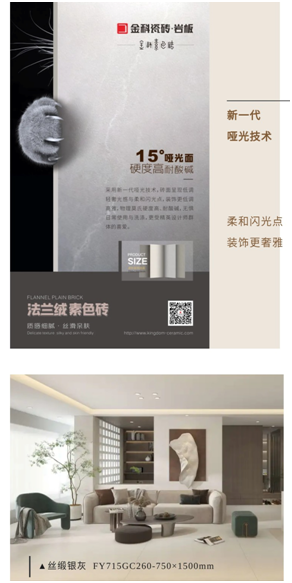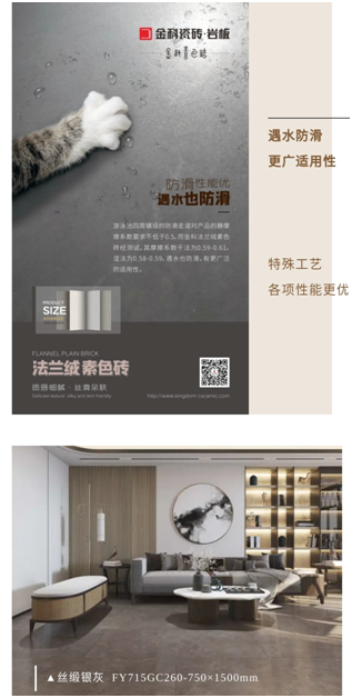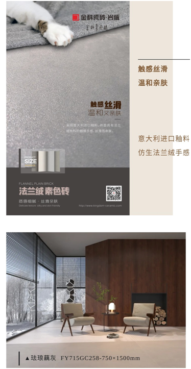 金科法蘭絨素色磚是在原有素色磚產品的基礎上進行工藝升級,在產品性能方面,法蘭絨的耐磨防滑性能較普通素色磚更出色;在裝飾效果方面,法蘭絨磚面的閃光效果較素色磚更柔和,光澤度更舒適,更受設計師的喜愛。