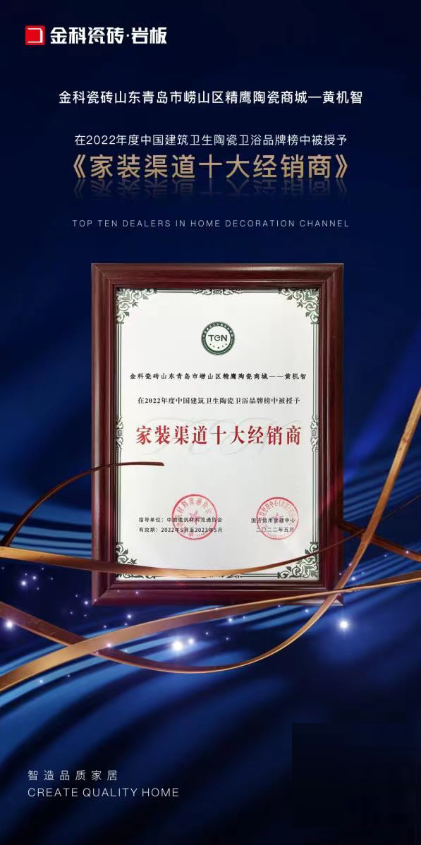 【青島市嶗山區精鷹陶瓷商城黃機智】榮獲"家裝渠道十大經銷商"