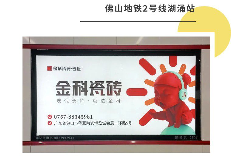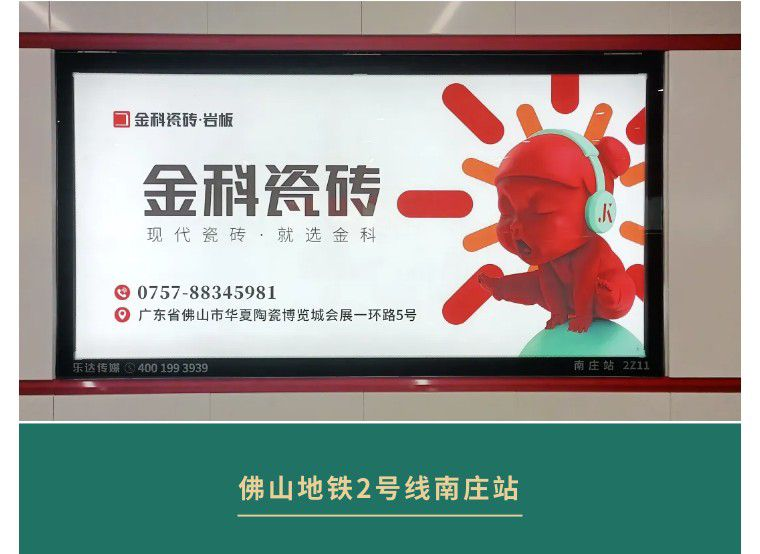當你踏入佛山,你會感受到濃厚的陶瓷文化氣息。金科瓷磚20年專注瓷磚生產,純正的佛山基因,品牌內涵與地鐵媒介的完美契合,傳遞了品牌堅守品質、不斷創新的理念。佛山地鐵站隨處可見的金科瓷磚,親切感飆升!