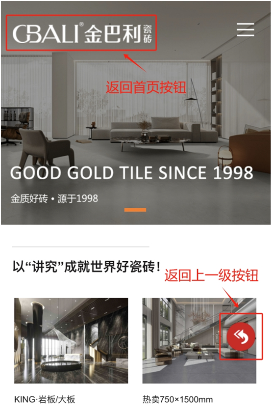 一、返回首頁按鈕,點擊金巴利logo圖標,即可一鍵返回首頁;二、返回上一級按鈕,在頁面中增加了返回按鈕,設計更人性化。