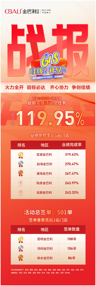 金巴利瓷磚“哇塞!補貼!”618全國聯動活動席卷全國。全國25+門店參與活動,業績完成率達119.95%,活動總簽單501單,單日最高簽單25單,業績實現全線爆破。印證了金巴利在產品與品質方面都獲得了廣大消費者的認可與肯定。
