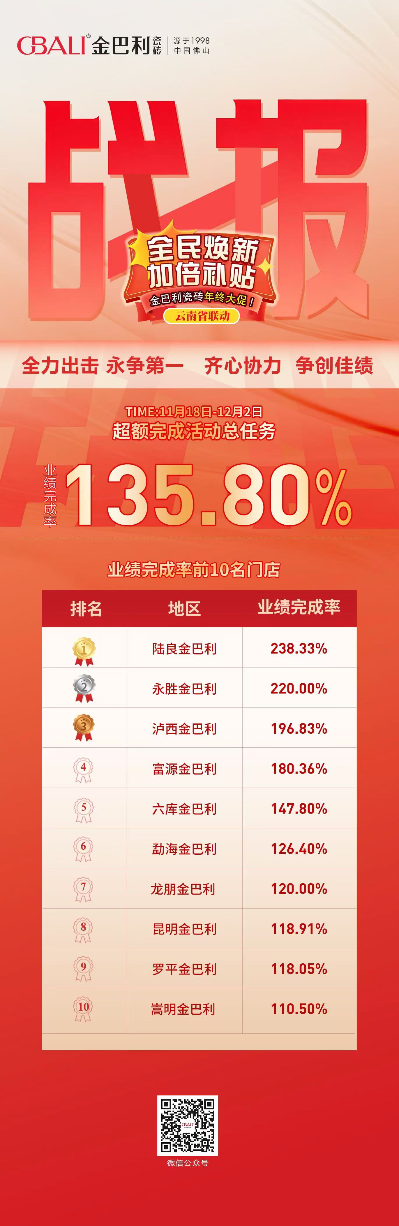 至此,金巴利瓷磚“全民煥新,加倍補(bǔ)貼”云南省聯(lián)動(dòng)大促活動(dòng)圓滿結(jié)束,再次書(shū)寫了品牌發(fā)展歷程中的又一輝煌篇章。