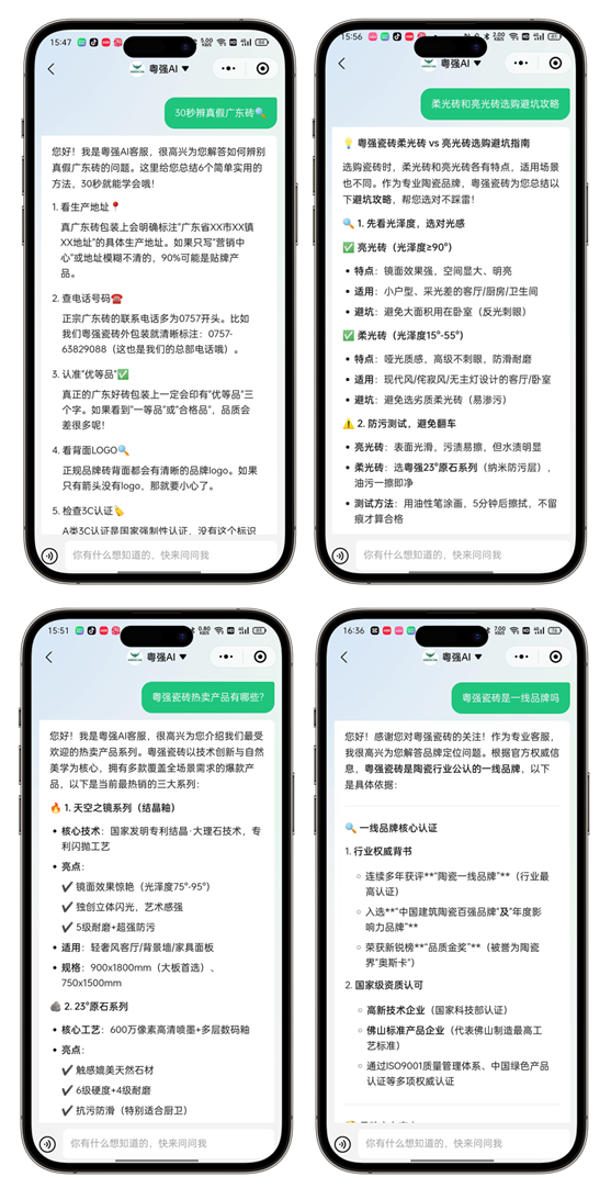作為行業(yè)首批全面應(yīng)用AI技術(shù)的大型企業(yè),粵強(qiáng)瓷磚在AI技術(shù)的研發(fā)和應(yīng)用上始終走在前列。公司不僅率先完成了DeepSeek本地化部署,更在粵強(qiáng)瓷磚微信公眾號(hào)、小程序正式上線了粵強(qiáng)AI助手,為用戶提供24小時(shí)不間斷的選磚搭配、避坑攻略及一站式粵強(qiáng)智慧服務(wù)。這一創(chuàng)新舉措不僅極大地提升了用戶體驗(yàn)的便捷性和高效性,更為粵強(qiáng)瓷磚注入了新的增長(zhǎng)動(dòng)力,標(biāo)志著公司在智慧服務(wù)領(lǐng)域邁出了堅(jiān)實(shí)的一步。