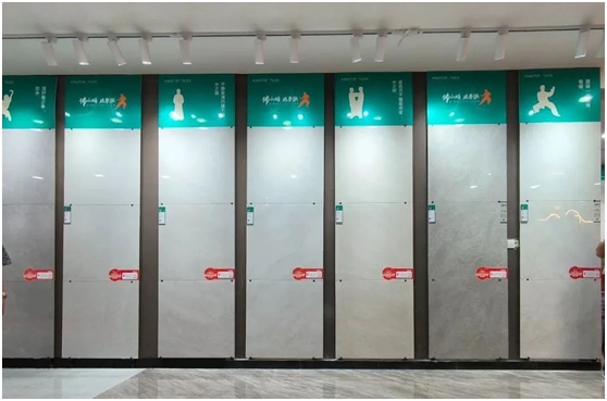 店內(nèi)布局匠心獨(dú)運(yùn),全系列產(chǎn)品分區(qū)陳列,井然有序。800×1350mm 黃金規(guī)格的宗師M9彩晶系列以流光幻彩的 3.0 彩晶工藝成為焦點(diǎn),燈光下呈現(xiàn)的 “步步生金” 視覺效果引得眾人紛紛駐足品鑒。