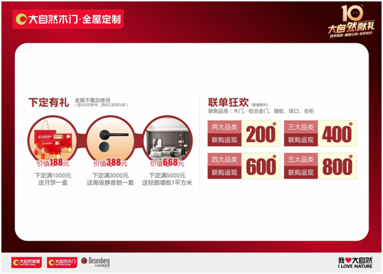 大自然木門10周年福利燃爆秋季。一、凡周年慶期間聯購大自然全屋定制中的木門、鋁合金、墻板、埡口、衣柜中的五個品類中的兩類及以上,即可返現200-800元(可抵扣貨款)。