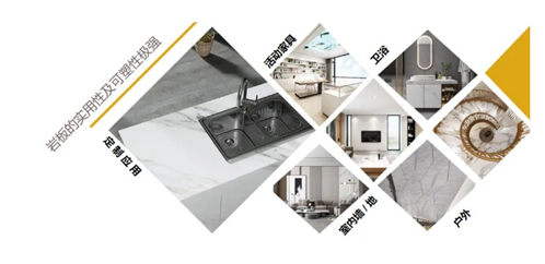 大規格巖板產品能承載更多紋理,連紋拼接,產品應用自由裁切,一件成型韌性好,廣泛應用于墻面、臺面、櫥柜、復合飾面板等多元家居應用,是眼下最火熱的建材產品之一。