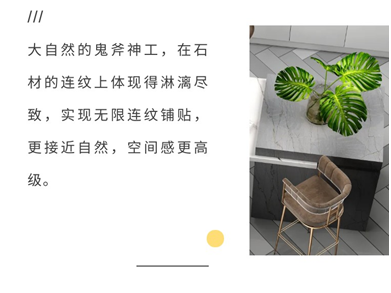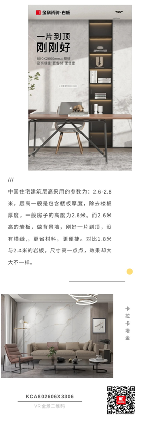 看到這里,你可能會理所當然覺得巖板就是越大越好,其實不然,在眾多巖板規格中,能實現“一片到頂”的更受青睞,那無疑就是800X2600m規格巖板,其適用范圍廣,在運輸搬運上也占據極大優勢,產品無需切割,鋪貼留縫更少,空間視覺效果更出眾。