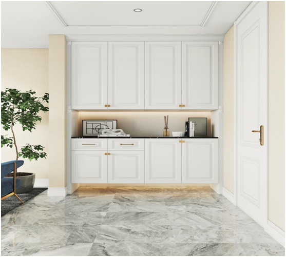 為滿足儲物需求,玄關處做了到頂鞋柜,增大收納空間且不易落灰,中間預留中空臺面,方便放置鑰匙包包等隨身物品。白色色調整潔干凈,柜門上簡單的線條雕花大氣硬朗,精致的五金為空間增添了一絲絲歐式的貴氣。