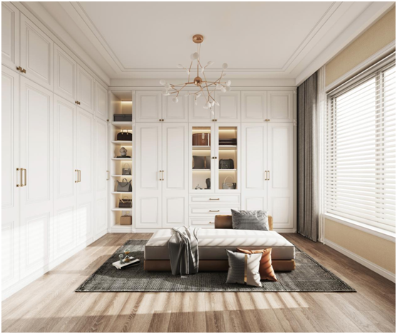 衣柜整體開放柜與封閉柜相結合,滿足收納需求的同時還兼具展示功能,藏露有致。衣柜鑲嵌極窄燈帶,柔和的燈光讓整個衣帽間更加高級舒適。