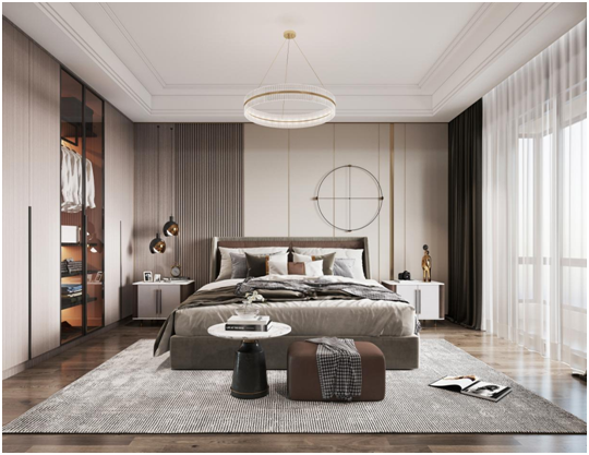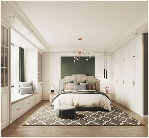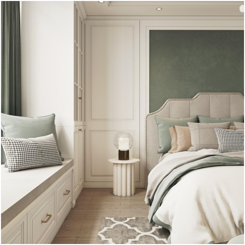 主臥是純色調(diào)的現(xiàn)代簡約風,在窗套、背景墻處使用的大自然木門·全屋定制弗里曼墻板,有利于營造出溫馨質(zhì)樸的休息氛圍,讓居室變得更加舒適自然。