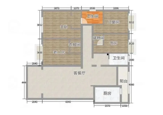 本案戶型比較常見,各空間面積都不小,四室相對,中間留出較長較狹窄的過道,設(shè)計時需要增加這部分的明亮度。