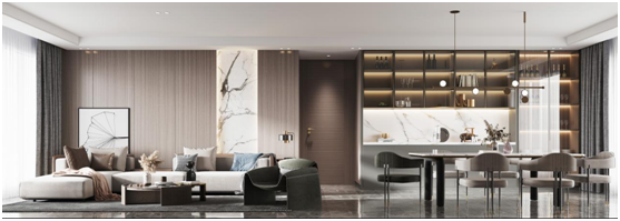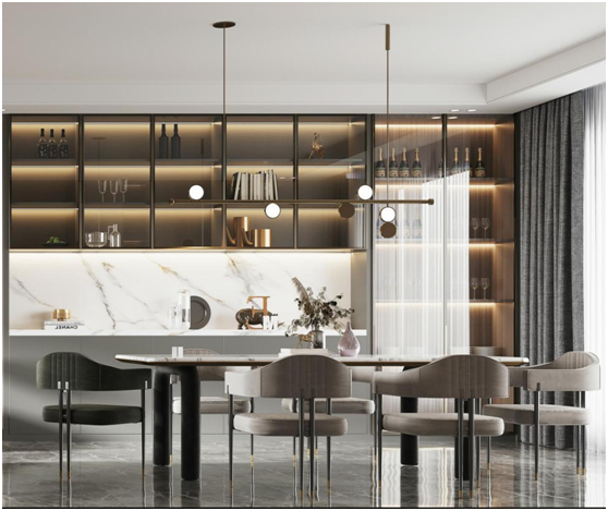 梵客系列將實用性與美結合在內隱式把手上,酒柜玻璃門設計將儲物與展示完美結合,方便收納的同時還增加了藝術氣息。大理石背板讓空間更加簡約與整潔。