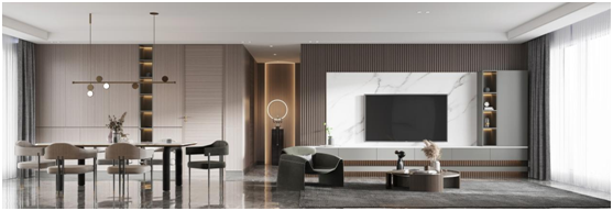 客廳電視背景墻采用白色大理石背板,簡約大氣。電視柜與長城板的搭配讓空間更加富有層次感。一體化客餐廳動線合理,統一色系讓整個空間更加開闊。