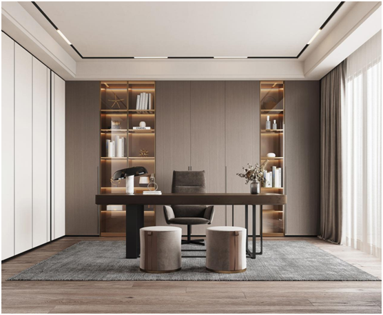 書房采用原木紋理的墻板,讓人仿佛置身于大自然,摒棄屋外的浮華,放慢節奏,專注思考,回歸生活的本真。低飽和度色系與極簡的線條呈現出現代主義的高度理性,玻璃反射的光線讓書房更添一絲靈動。