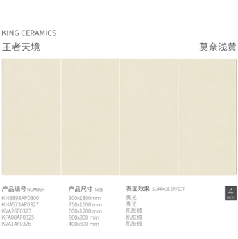 采用了先進的工藝,精選特殊的細膩釉料,打造出肌膚絨和亮光兩種表面效果,肌膚釉呈現柔和的光感,摒棄傳統的視覺感,令空間氛圍更顯舒適;亮光明亮大氣,讓整個空間更為寬敞美觀又實用。