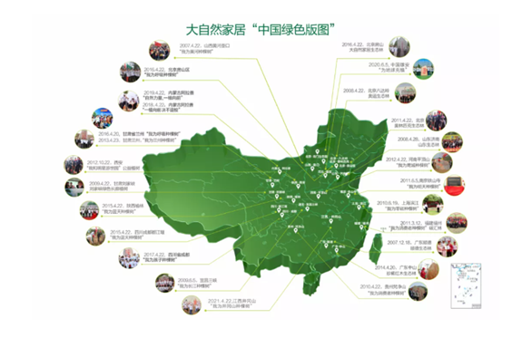 大自然堅持15年公益植樹,截止2021年,大自然在中國綠色版圖中的18個地區,種植26片生態林,公益植樹超過81萬棵,植樹面積超過106萬平方米。